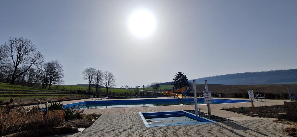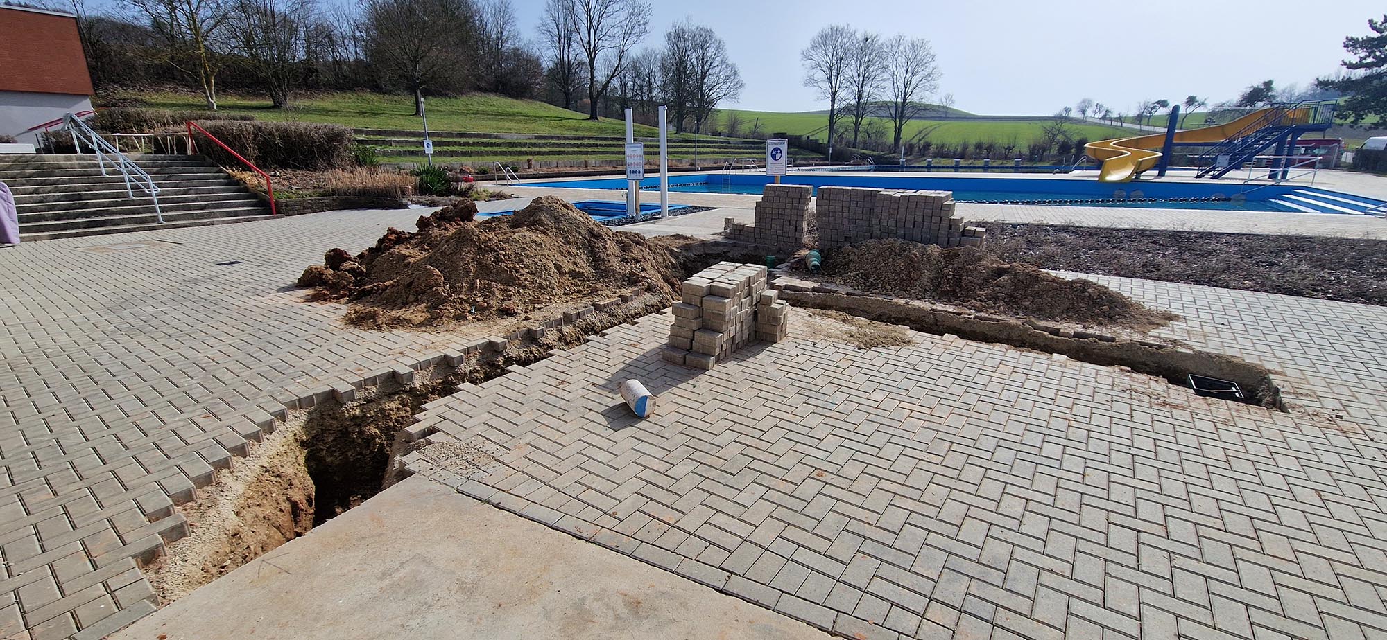 Exakt ein halbes Jahr nach dem Abschwimmen starten die Vorbereitungen für die kommende Saison. Wir machen alles „hübsch“ und einsatzbereit, die Gemeinde repariert derweil den defekten Abfluss vom Durchschreitebecken.